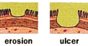 Erosion is a shallow break in the mucosa while ulcer is a full thickness break in the mucosa. The important difference between both of them is that erosions and ulcers can reach muscularis mucosa but only ulcers can penetrate muscularis mucosa, erosions do not penetrate it.