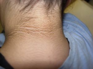 It is a condition in which there is hyperpigmentation and thickening of the skin in certain areas, most commonly in the back of neck, axilla, and groin. The exact causes of acanthosis nigricans vary and are often unknown. In some cases, it can be hereditary, other causes are endocrine causes such as cushing's syndrome or addison's disease. The most important clinical significance of this condition is diabetes mellitus, as it occurs in the prediabetic stage, thus the diagnosis of DM can be made early. Treatment is by life modifications, treating the underlying cause, or using creams or lotions to lighten the skin.