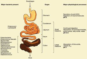 It is important to know the most predominant bacteria in each part of the gastrointestinal tract. In the upper G.I.T the aerobic organisms are more common as in stomach we can find lactobacilli or streptococcus species. While in the lower G.I.T we can find anaerobic organisms more than aerobes as in large intestine we find bacteroides and lactic acid bacteria are more common. This graph shows the dominant organisms in the major parts of gastrointestinal tract along with its function.