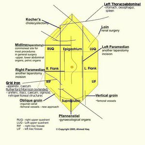 As in now and before open surgeries are used, from the scar of the surgery and the place you can know what surgery the patient have done, just from the inspection of the scar a past-surgery history can be made. This picture illustrates most of these scars. Note that nowadays most of the surgical procedures are done by using laparoscopy techniques which are almost scar free compared to open surgery.