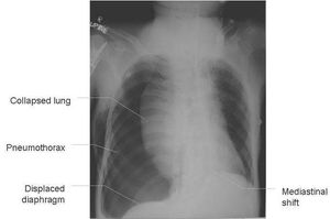 It is a serious type of pneumothorax that can become life threatening condition if left untreated with an imediate care. It results from positive pressure build-up secondary to a flap valve mechanism (or one-way valve) resulting in total lung collapse. There will be also Increased intrathoracic pressure restricts cardiac output that may result in shock and death. Symptoms are unilateral, pleuritic chest pain, breathlessness, respiratory distress, and shock symptoms.This X-Ray shows the radiological findings in case of tension pneumothorax.