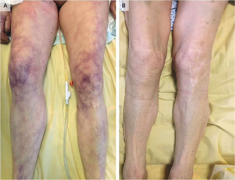 A 68-year-old woman was admitted to the intensive care unit with respiratory failure and hypotension. Her blood pressure was 70/50 mm Hg, and her heart rate was 125 beats per minute. Physical examination revealed skin mottling on the legs (Panel A). Laboratory values were notable for an arterial-blood lactate level of 4.5 mmol per liter (normal value, <2.0), a cardiac troponin T level of 0.43 ng per milliliter (normal value, <0.014), an N-terminal pro–brain natriuretic peptide level of 24,500 pg per milliliter (normal value, <900), and a positive polymerase-chain-reaction assay for adenovirus in bronchoalveolar-lavage fluid and blood. No other viruses or bacteria were found. Transthoracic echocardiography revealed a left ventricular ejection fraction of 25%. Skin mottling, a common clinical sign in patients in shock, is a violaceous discoloration of the skin that is due to skin hypoperfusion. It most often manifests in the area around the knees but can also be seen in the ears and fingers. The patient received a diagnosis of acute myocarditis due to adenovirus, complicated by cardiogenic shock. She was treated with supportive care including mechanical ventilation, plasma volume expansion, and inotropic agents. The skin mottling disappeared within 24 hours after treatment (Panel B), and the left ventricular ejection fraction increased to 60% by day 3 of treatment. The patient had a full recovery.