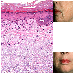 Actinic elastosis, also known as solar elastosis, is an accumulation of abnormal elastin (elastic tissue) in the dermis of the skin which occurs as a result of the cumulative effects of prolonged and excessive sun exposure, a process known as photoaging HISTOPATHOLOGY:Elastic fiber proliferation can be seen in the dermis. As the condition becomes more established, the collagen fibers of the papillary dermis and reticular dermis become increasingly replaced by thickened and curled fibers that form tangled masses and appear basophilic under routine haematoxylin and eosin staining. These fibers stain black with the Verhoeff stain.The haematoxyphilic elastic fibres called as basophilic degeneration are separated from the epidermis by a narrow band of normal appearing collagen (Grenz zone )with collagen fibres arranged horizontally.