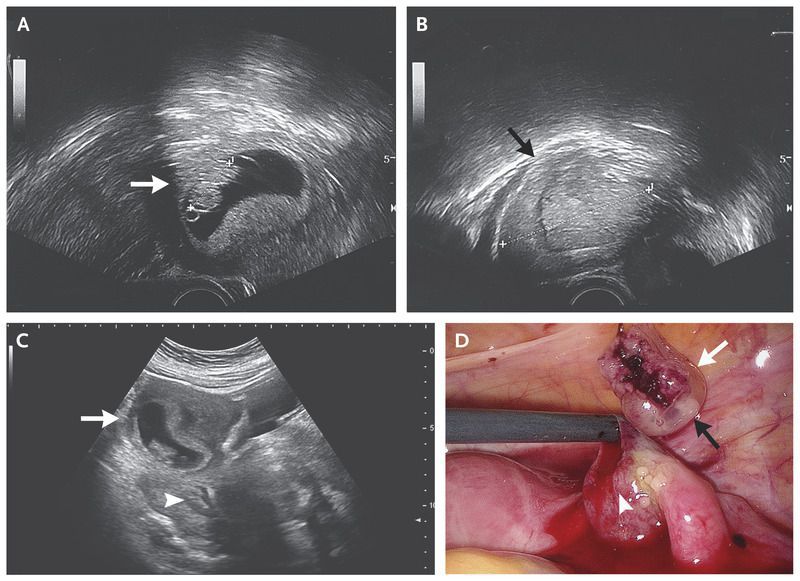 A 34-year-old woman with a history of appendectomy presented to the emergency department after 45 minutes of acute abdominal pain. Her last menstrual period was 9 weeks before presentation, and a normally conceived intrauterine pregnancy (8 weeks of gestation) had been diagnosed by her gynecologist by means of ultrasonography (Panel A, arrow). On examination, she had hypotension, tachycardia, and appreciable tenderness in the right lower abdomen. Transvaginal ultrasonography revealed a 4-cm-by-4-cm right adnexal mass (Panel B, arrow) and intrauterine pregnancy (Panel C, arrow), as well as free fluid in the peritoneal cavity (Panel C, arrowhead), which caused concern about an ectopic pregnancy. An urgent laparoscopy was performed. On laparoscopy (Panel D), a ruptured ectopic pregnancy was seen in the right fallopian tube (arrowhead), and an intact gestational sac (white arrow) and embryo (black arrow) were also seen. Large hemoperitoneum was present, with active bleeding from the ruptured site in the fallopian tube. A salpingectomy was performed. Heterotopic pregnancy is the rare occurrence of a simultaneous intrauterine and extrauterine pregnancy. The incidence of heterotopic pregnancy in natural conception is estimated to be 1 in 30,000 pregnancies. In this case, the intrauterine pregnancy remained intact, and a healthy girl was delivered at term.