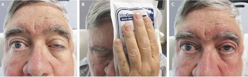 A 68-year-old man presented with unilateral ptosis and no other symptoms. The neurologic examination revealed ptosis of the left eye after a sustained upward gaze (Panel A). The movements of the extraocular muscles were normal. Myasthenia gravis was suspected, and the ice-pack test was performed with the placement of an instant cold pack over the left eye (Panel B). After 2 minutes, the ptosis was substantially diminished (>5 mm), indicating a positive test (Panel C). The diagnosis was further supported by the presence of serum anti–acetylcholine receptor antibodies and by electrodiagnostic testing, which showed a decremental response to repetitive nerve stimulation. The ice-pack test can be a useful bedside test to distinguish myasthenia gravis from other causes of ptosis or ophthalmoparesis. The inhibition of acetylcholinesterase activity at a reduced muscle temperature is thought to underlie the observed clinical improvement. The patient was treated symptomatically with pyridostigmine, and the ptosis was diminished.
