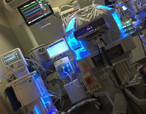 Bb on iNO, HFO, phototherapy, Invasive arterial BP, tcPCO2 and chest tube.