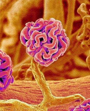 This's an electron micrograph of glomerulus.The glomerulus is a tuft of small blood capillaries located within the Bowman's capsule of the kidney. The main function of the glomerulus is to filter plasma to produce glomerular filtrate, which passes down the length of the nephron tubule to form urine.The rate at which the glomerulus produces filtrate from plasma is known as the glomerular filteration rate (GFR).The glomerulus is one of the key structures that make up the nephron, the functional unit of kidney.