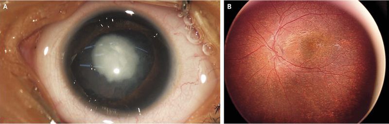 An 8-month-old child was brought to pediatric ophthalmology services by his parents, who reported that he had had white opacities in both eyes and “shaky” eyes since 4 months of age. On examination, the child had wandering eye movements with bilateral central, dense, white, nuclear congenital cataracts (Panel A), bilateral microcornea (corneal diameter in each eye, 10 mm), bilateral microphthalmia (axial length of each eye, 17 mm), and nystagmus. Fundus examination revealed a normal optic disk with rubella retinopathy — a classic salt-and-pepper appearance of the retina that is due to the distribution of areas of increased and decreased pigmentation (Panel B). Serum studies showed IgM and IgG antibodies that were positive for rubella. The maternal rubella immunity status was not known; the mother had not been vaccinated. A diagnosis of the congenital rubella syndrome was made. The child underwent cataract surgery (lens aspiration with primary posterior capsulotomy and anterior vitrectomy) in each eye, with 1 week between surgeries. Postoperative visual rehabilitation was done with the help of customized, soft, extended-wear, lenticular contact lenses over the corneas of both aphakic eyes Further evaluation by a pediatric cardiologist revealed the presence of patent ductus arteriosus requiring ligation. At the last follow-up visit, when the child was 5 years and 4 months of age, he had reduced nystagmus and improved binocular visual acuity of 20/60 (monocular vision, 20/80) and was living the normal life of a school-age child. Vaccination before pregnancy can prevent the congenital rubella syndrome.