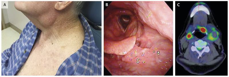 A 68-year-old man presented with a mass on the left side of his neck (Panel A). He had no history of tobacco use and drank one or two alcoholic drinks per week. A biopsy of the mass was performed, and histopathological examination revealed squamous-cell carcinoma that tested positive for human papillomavirus and overexpressed p16, a tumor-suppressor gene product. Flexible nasolaryngoscopy showed an exophytic mass on the left base of the tongue and epiglottic vallecula (Panel B). Positron-emission tomography showed uptake of 18F-fluorodeoxyglucose in the vallecula and bilateral jugulodigastric lymphadenopathy (Panel C). Human papillomavirus–associated squamous-cell carcinoma occurs commonly in the oropharynx, even in patients who do not have the traditional risk factors for head and neck cancers, such as smoking and alcohol use. This patient was treated with radiation therapy with sensitizing chemotherapy and has recovered well, with no evidence of disease 7 months after treatment.