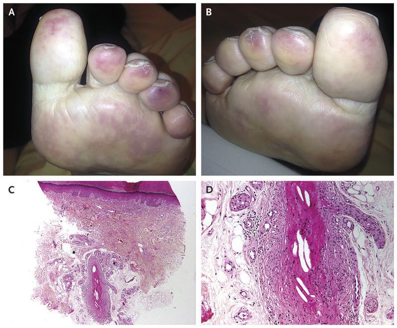 An 88-year-old man with a history of myocardial infarction for which he had required quadruple coronary-artery bypass grafting presented with mottled-appearing purple discoloration of the skin on his toes. One month earlier, he had undergone transapical transcatheter aortic-valve replacement (TAVR). The discoloration of the skin on his toes (Panels A and B) was consistent with livedo reticularis. Laboratory findings were notable for a serum creatinine level of 2.8 mg per deciliter (248 μmol per liter), which had increased from a baseline level of 1.4 mg per deciliter (124 μmol per liter), and a white-cell count of 10,200 per microliter with 13% eosinophils (absolute eosinophil count, 1170 per microliter). A skin-biopsy sample revealed obstructive cholesterol crystals in midsized arteries, which confirmed the diagnosis of the cholesterol embolization syndrome (Panels C and D). This syndrome is caused by distal showering of cholesterol crystals and can involve many organ systems, including the peripheral vasculature, kidneys, and brain. It is a well-described complication of angiography, vascular surgery, thrombolytic therapy, and more recently, TAVR. The patient was treated with oral prednisone and statins. The skin lesions resolved within 3 weeks, but the patient did not recover normal renal function.