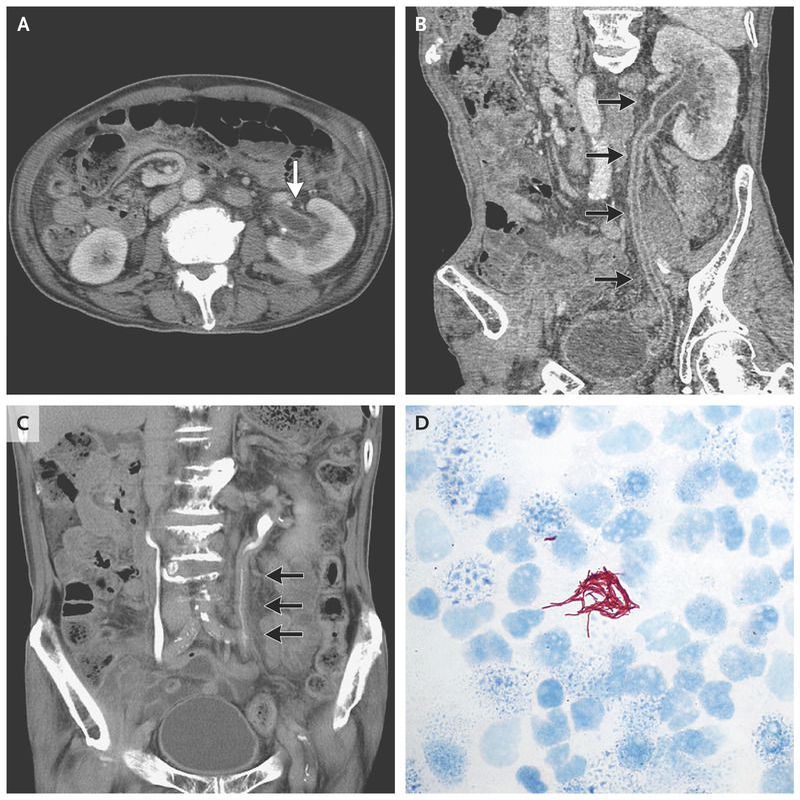 A 76-year-old man with diabetes and a 2-year history of mediastinal lymphadenopathy of unknown cause presented with fever and fatigue. Pyuria was seen on urinalysis. Contrast-enhanced computed tomography (CT) of the abdomen showed mild dilatation of the left renal pelvis and thickening of the ipsilateral ureteral wall (Panels A and B, arrows); the excretory phase on CT showed mild narrowing of the left ureter (Panel C, arrows). He was treated with a beta-lactam antibiotic, but pyuria and fever persisted. The results of a urine culture were negative. Urinary acid-fast staining revealed the presence of acid-fast bacilli (Panel D). A polymerase-chain-reaction assay for Mycobacterium tuberculosis was positive. Patients with urinary tract tuberculosis can present with dysuria and hematuria, though many patients are asymptomatic, with only sterile pyuria, with or without microscopic hematuria. Urogenital tuberculosis may cause complications, such as ureteral strictures, oligospermia in men, and vaginal bleeding in women. The patient was treated with multiple-drug therapy for tuberculosis, and his symptoms abated.