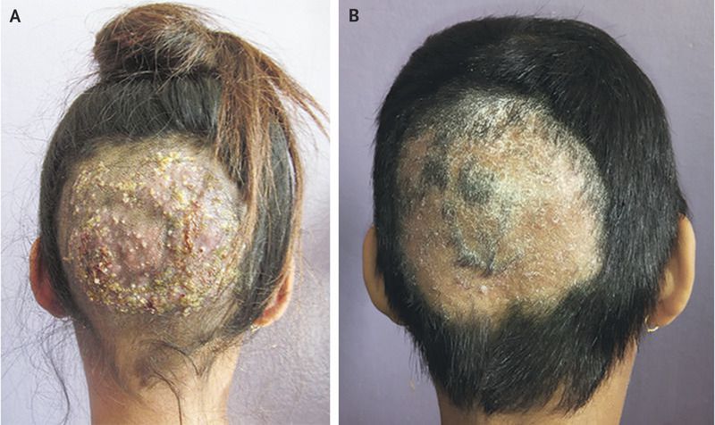 A 13-year-old girl presented with a slowly enlarging, painful swelling of the scalp that had first been noticed 3 weeks earlier. She had received several courses of empirical oral antibiotics for suspected bacterial folliculitis and cellulitis, without improvement. On examination, there was an erythematous, mildly tender, boggy swelling overlying her occiput (Panel A). The lesion was studded with pustules and had associated serosanguineous discharge and alopecia. A sample from the involved area was obtained, and a 10% potassium hydroxide preparation revealed fungal hyphae and confirmed the diagnosis of a kerion. A kerion is an inflammatory, dermatophytic, fungal infection of the scalp that is usually seen in children. It is characterized by a suppurative, tender swelling that is often associated with regional lymphadenopathy and can be mistaken for bacterial folliculitis. Kerion is most commonly caused by the zoophilic dermatophytes Trichophyton verrucosum and Trichophyton mentagrophytes. Treatment with oral griseofulvin is often used, although other antifungal agents may also be effective. A delay in diagnosis and treatment can result in scarring alopecia. This patient was treated with griseofulvin for 6 weeks and showed marked improvement, with regression of the lesion (Panel B).