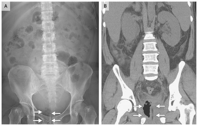 A 42-year-old man with diabetes presented to the emergency department with severe dysuria and incontinence, which he had had for several days. Laboratory studies were notable for pyuria on urinalysis, leukocytosis (a white-cell count of 10,820 per cubic millimeter), elevated C-reactive protein levels (134.1 mg per liter), hyperglycemia (glucose level, 900 mg per deciliter [50 mmol per liter]), and an elevated level of glycated hemoglobin (11.4%). Radiography of the kidney, ureter, and bladder showed an atypical focus of gas accumulation behind the right pubic ramus (Panel A, arrows). Subsequent computed tomography (CT) of the abdomen revealed emphysematous prostatitis of the right prostate lobe (Panel B, arrows). A Foley catheter was placed, and CT-guided percutaneous drainage of the prostate was performed. Broad-spectrum antibiotics and intravenous fluid therapy were initiated, and strict blood sugar control was implemented with an insulin drip. Urine and blood cultures grew Klebsiella pneumoniae. The patient remained in the hospital for 1 month and was treated for infection, sepsis, poor control of blood sugar levels, and acute kidney injury. His condition gradually improved, and he was discharged home. Emphysematous prostatitis is a rare sequela of complicated urinary tract infection and is more commonly found in patients with immunosuppression, diabetes mellitus with poor glycemic control, liver cirrhosis, alcoholism, or recent urethral instrumentation. The most common pathogen in patients with diabetes, as in this case,