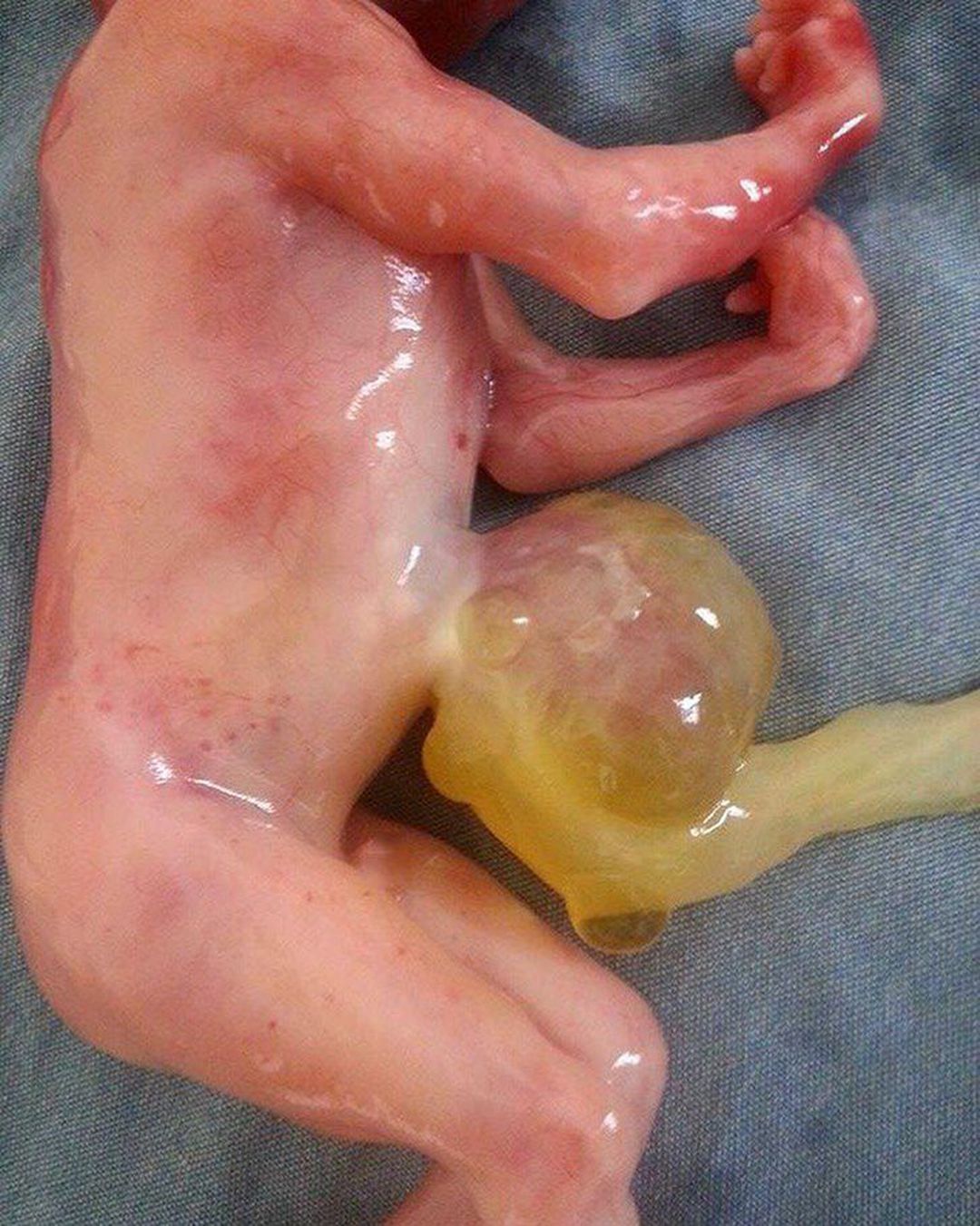Pictured is an omphalocele, a congenital condition in which a baby is born with their intestines outside the body in a thin peritoneal sac. Unfortunately in this case, the baby was also shown to have a chromosomal abnormality and further workup showed multiple malformations making life impossible. In normal development the midgut pushes into the umbilical cord around the 6th week to make room for other abdominal organ to grow. In the 10th week the midgut rotates 270 degrees around its primary artery, the superior mesenteric artery, and is configured into the position it will be in for the rest of its life. In certain genetically predisposed embryos, such as those with trisomy 18 (Edwards Syndrome) or other structural abnormalities, parts of the body wall do not form properly and the midgut the fails to return back into the abdominal cavity. This process results in omphalocele. Omphalocele is often detected during routine ultrasound during prenatal care and must be distinguished from gastroschisis, a different disorder of development that also results in newborns born with intestines outside of the body cavity. Thankfully, this condition is rarely fatal on its own and is often found well before the baby is born, which allows the obstetrician to direct the expecting mother to appropriate post-natal care.