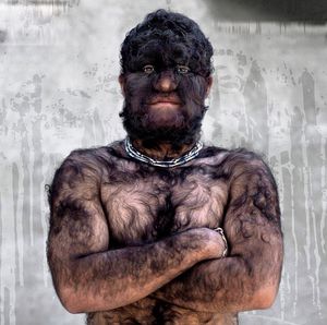 The excessive hair growth above the normal for the age,sex and race of an individual. When hypertrichosis is hormonal in origin, then it is termed as Hirsuitism. Hypertrichosis may be congenital or acquired. •Cause: The cause of hypertrichosis is unknown. Congenital hypertrichosis is believed to be a genetic disorder that is inherited or occurs as a result of spontaneous genetic mutation. •Treatment: Treatment of hypertrichosis is hair removal. Several methods are available but need to be repeated regularly as hair continues to grow back and are: - Repeated shaving. - Chemical epilation. - Electrolysis and thermolysis. - Waxing. More recently, laser hair removal has been proposed as a treatment option for hypertrichosis. The man above has a very rare type of hypertrichosis called "Congenital Hypertrichosis Lanuginosa". Only about 50 cases of this type has been reported worldwide.