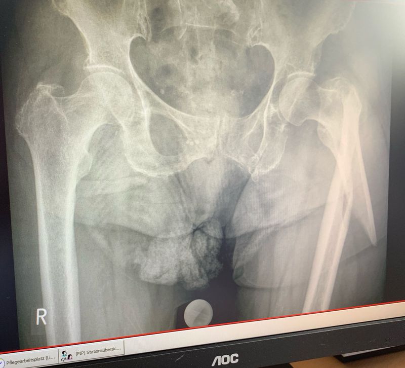 This Patient came to the hospital with an beautiful Femuralis fracture of the left leg. This patient fell down a Stair and felt big pain in the right thighs.