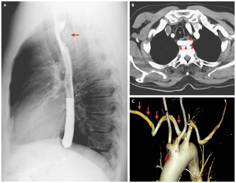 A 46-year-old otherwise healthy man presented with a 1-year history of occasional dysphagia to solid foods that was not accompanied by weight loss. The results of a physical examination were unremarkable. A barium-swallow examination revealed posterior oblique indentation of the proximal esophagus (arrow in Panel A and Panel B; T indicates the trachea in Panel B). A computed tomographic scan of the chest with contrast enhancement showed an aberrant right subclavian artery (Panel B, arrowheads; also indicated by arrows in Panel C, a three-dimensional reconstruction) originating as the third branch of the aortic arch, distal to the truncus bicaroticus (a vascular anomaly in which the carotid arteries have a common origin) (Panel C, asterisk) and to the left subclavian artery. The aberrant right subclavian artery followed a retroesophageal course, resulting in a prominent compression of the esophagus, a finding consistent with dysphagia lusoria. The patient was referred to a vascular surgeon; because the dysphagia was only mild to moderate, the patient declined surgery and was therefore treated conservatively with lifestyle modification. Most patients with an aberrant subclavian artery are asymptomatic. Children may present with recurrent pulmonary infections or stridor, in contrast to adults, who more often present with dysphagia. The onset of symptoms in adulthood, as in this case, is relatively rare.