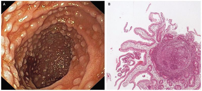 An 18-year-old woman presented with recurrent episodes of diarrhea associated with epigastric discomfort and bloating. Examination of the stool revealed trophozoites of the species Giardia lamblia. She underwent gastroduodenoscopy, which revealed numerous nodules in the duodenum (Panel A). Multiple biopsies of the nodules were performed, and histologic examination of the specimens revealed normal villi with prominent lymphoid follicles in the lamina propria, findings consistent with nodular lymphoid hyperplasia (Panel B). Further evaluation revealed evidence of hypoglobulinemia and low levels of IgG, IgA, and IgM in serum. A diagnosis of common variable immunodeficiency with nodular lymphoid hyperplasia was established. Approximately 20% of patients with common variable immunodeficiency may have nodular lymphoid hyperplasia, a condition that can mimic gastrointestinal polyposis. Nodular lymphoid hyperplasia may be associated with symptoms such as diarrhea and malabsorption in some patients, whereas other patients may be asymptomatic. The patient’s diarrhea abated with metronidazole treatment; she was counseled about the risk of infection associated with common variable immunodeficiency.