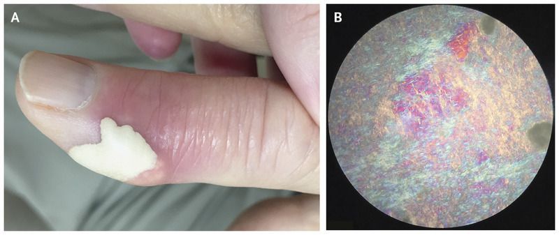 A 71-year-old man with a history of gout and renal transplantation (for which he was receiving cyclosporine) presented with a new blister overlying the radial aspect of the second interphalangeal joint just distal to a preexisting tophus on his right hand (Panel A). The patient reported having had no trauma to the involved area. Examination of the fluid with polarized light microscopy showed sheets of negatively birefringent crystals consistent with monosodium urate (Panel B). The patient was treated with allopurinol, with a daily dose that was progressively increased from 100 mg to 300 mg until the serum uric acid measurement was 5 mg per deciliter (297 μmol per liter) or less. Shortly thereafter, his symptoms abated. Gout is a common disorder that has an increased incidence after renal transplantation. Tophi or simply inflamed joints are the most common presentations, although in rare cases bullae filled with milk of urate can develop. These gout bullae have been associated with mild repetitive trauma, not unlike the formation of traditional blisters. The goal of treatment is typically a serum uric acid level of less than 6 mg per deciliter (357 μmol per liter) in nontophaceous disease or 5 mg per deciliter in tophaceous disease.