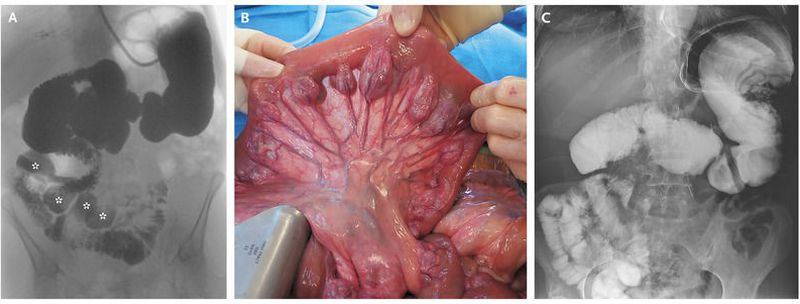A 67-year-old woman with a 6-month history of malabsorption and malnourishment was referred for possible intestinal transplantation. She had a body-mass index (the weight in kilograms divided by the square of the height in meters) of 19. The patient was receiving only parenteral nutrition because of a long-standing history of jejunal diverticulosis with bacterial overgrowth that was resistant to long-term antibiotic treatment. Six years earlier, a small-bowel derotation and cecopexy had been performed after she had had an episode of gastrointestinal obstruction; however, nausea and diarrhea remained. During the 2 years before the current presentation, she had reported having frequent episodic nausea, abdominal distention, and colic followed by violent fecaloid vomiting. Workup of these symptoms included computed tomography, which showed small-bowel dilatation along with a whirl sign and numerous collateral veins, suggestive of a midgut volvulus (see video). A small-bowel series, performed after decompression by a nasogastric tube, showed the known jejunal diverticulosis (Panel A, asterisks). It also revealed malrotation, with the duodenum not crossing the midline and the jejunum positioned in the right abdomen. Exploratory laparotomy confirmed intestinal malrotation with chronic midgut volvulus, together with a duodenal diverticulum and extensive jejunal mesenteric diverticulosis (Panel B). After resection of the duodenal diverticulum and jejunum and a Ladd procedure, the patient was left with 270 cm of healthy ileum (Panel C). Two months later, the patient had been completely weaned from parenteral nutrition. One year after surgery, her body-mass index had increased to 24, she was symptom-free, and she had returned to a normal lifestyle.