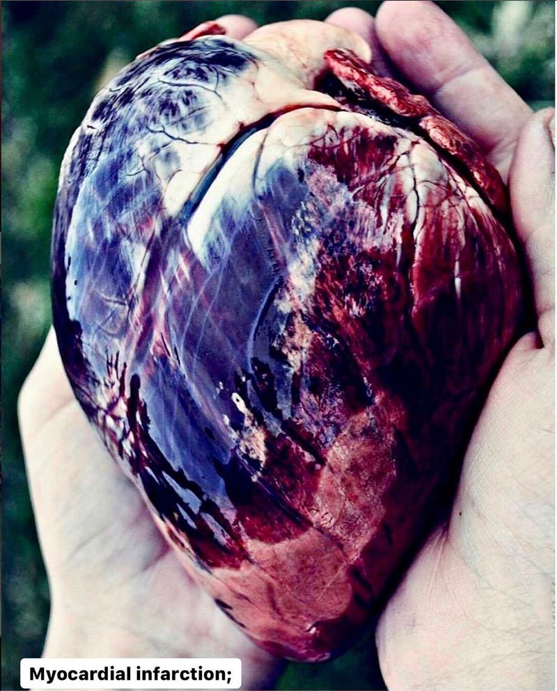 This heart was removed from an organ donor who suffered from a myocardial infarction called death of the heart's musculature. The heart requires its own constant supply of oxygen and nutrients, like any muscle in the body. The heart has three coronary arteries, two of them are large, branching arteries that deliver oxygenated blood to the heart musculature. If one of these arteries or branches becomes blocked suddenly, a portion of the heart is starved of oxygen, a condition called "cardiac ischemia." If cardiac ischemia lasts too long, the starved heart tissue dies, the so called a heart attack, pathologically known as a myocardial infarction.