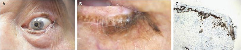 An 87-year-old man presented for treatment of a stye on his left upper eyelid. Despite conservative interventions, the stye had persisted and the skin had become noticeably darker over several weeks (Panels A and B). He reported itching but no pain or bleeding. His risk factors for skin cancer included a history of prolonged sun exposure while working as a lifeguard. A biopsy specimen from the margin of the left upper eyelid was obtained and on examination revealed invasive lentigo maligna melanoma, with a Breslow thickness of 0.35 mm, no ulceration, and no mitogenesis (Panel C, Melan-A stain). The patient was subsequently referred to the melanoma clinic for multidisciplinary management of care, but he declined treatment and was lost to follow-up. Primary melanoma of the eyelid is rare, accounting for less than 1% of cutaneous melanomas and less than 1% of malignant tumors of the eyelid. Lentigo maligna melanoma is the most common histologic subtype of melanoma involving the eyelid. The lower eyelid is more often involved than the upper eyelid, given its more direct exposure to sunlight.
