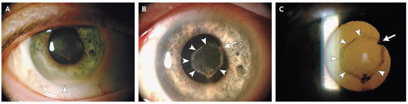 A 49-year-old man with a history of diabetes mellitus reported having blurry vision in the right eye 3 days after being admitted to the hospital for investigation of elevated levels of creatinine, liver enzymes, and bilirubin following 9 days of generalized weakness. He had been receiving treatment for bacteremia caused by Klebsiella pneumoniae associated with bilateral renal cortical abscesses (Fig. S1 in the Supplementary Appendix, The visual acuity of the right eye was “light perception.” The slit-lamp examination showed the presence of hypopyon (a collection of leukocytes in the anterior chamber) (Panel A, arrowhead), posterior synechiae (adhesions of the iris to the lens) (Panels B and C, arrows; broken synechia at 6 o’clock position), and fibrinous exudates covering the anterior lens capsule (Panels B and C, arrowheads). The funduscopic examination revealed dense vitritis. These findings were suggestive of endogenous endophthalmitis. The inflammation resolved but was complicated with vitreous condensation. B-scan ultrasonography (also called brightness scanning) suggested an inferior tractional retinal detachment, for which pars plana vitrectomy with silicone-oil injection was performed. At a 10-week follow-up visit, the patient’s visual acuity in the affected eye had improved to 4/200. K. pneumoniae is a rare but notorious cause of endogenous endophthalmitis, especially among patients of Asian descent with diabetes, and is typically associated with primary liver abscesses. The visual acuity at presentation and early antibiotic treatment are important determinants of disease outcomes.