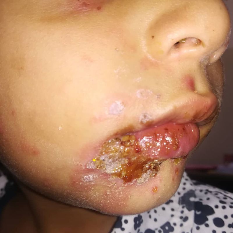 3 Y.O female patient presented to the clinic with this painful rash around the mouth and small lesions on the face, her sister also has the same thing, whats your DDX?