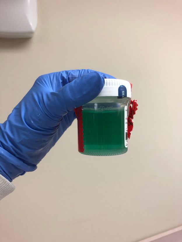 I work in toxicology for a pain management group and received this urine with no patient history. My assumption is high doses of amitriptyline (Elavil, tricyclic antidepressant) or use of propofol in same day procedure. Though it is possible it is caused by UTI with bacteria that has moved into the bloodstream (bacteremia) this is unlikely as this was an outpatient collection and not part of a hospitalization.