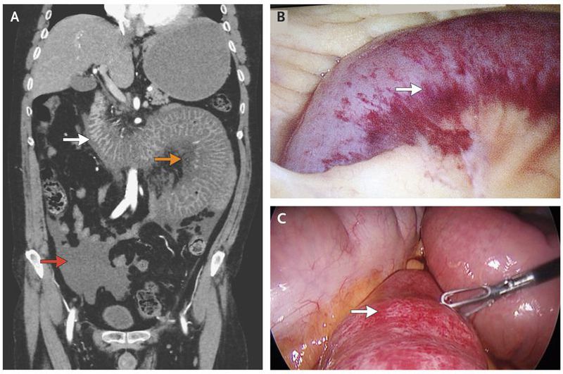 A 48-year-old man who was known to have granulomatosis with polyangiitis was admitted to the hospital for evaluation of an elevated blood creatinine level of 9.5 mg per deciliter (840 μmol per liter; normal range in men, 0.5 to 1.2 mg per deciliter [40 to 110 μmol per liter]). Urinalysis was notable for 2+ protein. The patient, who was positive for antineutrophil cytoplasmic antibody, had been taking azathioprine for 7 years before presentation. Several days after admission, severe abdominal pain developed suddenly, with changes consistent with peritonitis noted on examination. Workup, including computed tomographic angiography, was highly suggestive of bowel ischemia with wall thickening of the distal duodenum and jejunal loops (Panel A, white arrow) with adjacent fat stranding and mesenteric edema (orange arrow) and free fluid in the abdomen and pelvis (red arrow). The patient was taken to the operating room for laparoscopic exploration and was found to have a 40-cm hemorrhagic bowel segment just distal to the ligament of Treitz as well as hemoperitoneum (Panel B shows the involvement of the bowel wall from the mesenteric side and Panel C from the antimesenteric side; the arrow in each panel shows the intraoperative view of hemorrhagic bowel at level of proximal jejunum). The congested hemorrhagic bowel segment was viable, with evidence of active peristalsis, so no bowel resection was performed. This condition was thought to be bowel-wall vasculitis due to granulomatosis with polyangiitis. After surgery, the patient was treated with a heparin drip, and at 48 hours he had minimal abdominal pain. However, he had a persistent elevation of the blood creatinine level. During the same admission, he had rapid progressive worsening of kidney function, and the development of end-stage renal disease necessitated dialysis three times per week. There was no change in his treatment with azathioprine. At a follow-up visit 9 months after presentation, he reported no recurrent abdominal pain, there were no new manifestations of granulomatosis with polyangiitis, and he was receiving permanent renal-replacement therapy.