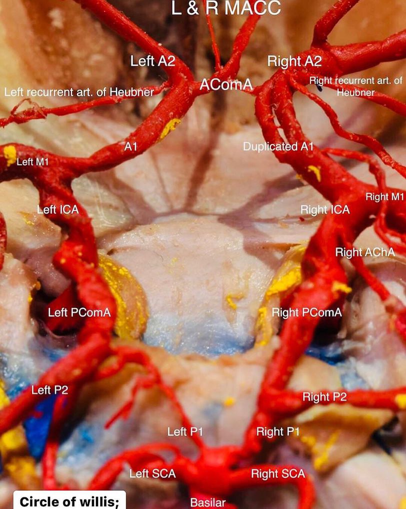 First up, note that the most important & unique part of this dissection is the depiction of the Median Artery of Corpus callosum (MACC) which is only present in 13% of the individuals! Circle of willis: The circle of Willis (Circulus arteriosus cerebri) is an anastomotic system of arteries that sits at the base of the brain. The "circle" was named after Thomas Willis by his student Richard Lower. The circle of Willis encircles the stalk of the pituitary gland and provides important communications between the blood supply of the forebrain and hindbrain (ie, between the internal carotid and vertebrobasilar systems following obliteration of primitive embryonic connections). Formation of the COW: The circle of Willis is formed when the internal carotid artery (ICA) enters the cranial cavity bilaterally and divides into the anterior cerebral artery (ACA) and middle cerebral artery (MCA). The anterior cerebral arteries are then united by an anterior communicating (ACOM) artery. These connections form the anterior half (anterior circulation) of the circle of Willis. Posteriorly, the basilar artery, formed by the left and right vertebral arteries, branches into a left and right posterior cerebral artery (PCA), forming the posterior circulation. The PCAs complete the circle of Willis by joining the internal carotid system anteriorly via the posterior communicating (PCOM) arteries. Medicogram - in collaboration with Dr. @juanj.altafulla , who helped us and made us able to publish this article for all of you! Thank As a matter of fact circle of willis is never been explained and depicted like this before!