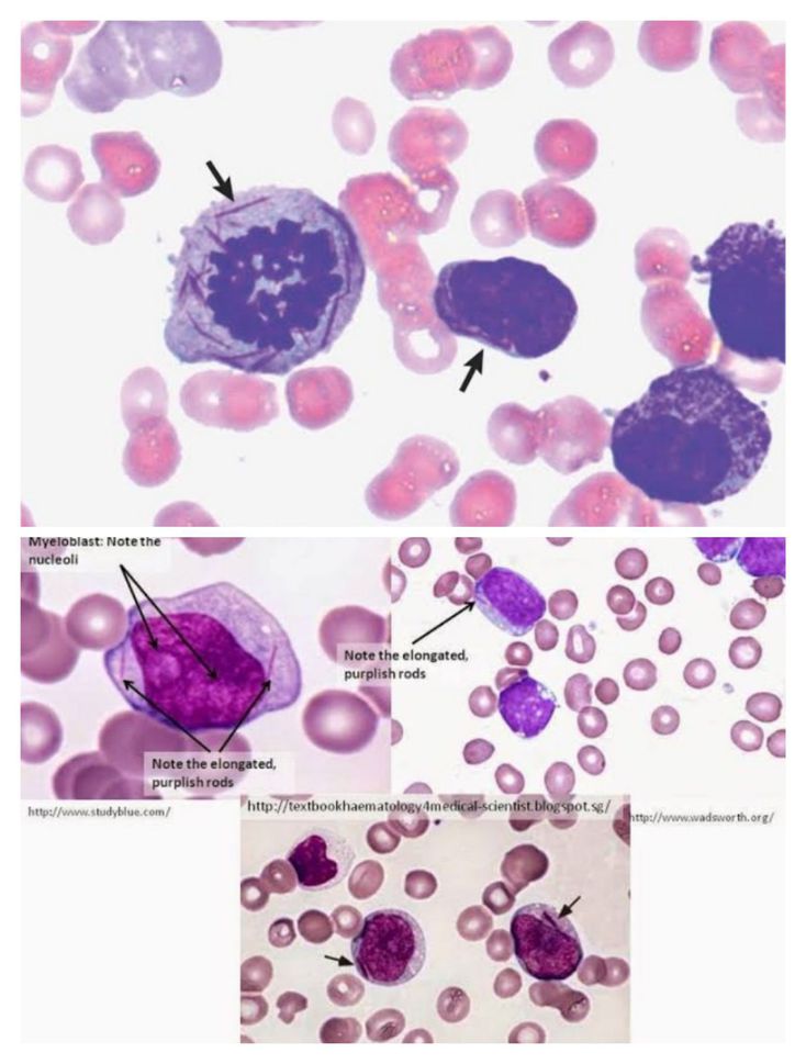 Auer rods seen in myeloblastic leukemia. Presence of Auer rods differentiate myeloblastic leukemia from lymphoblastic leukemia.