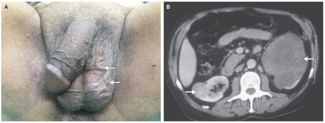 A 65-year-old man with no notable medical history presented to the urology clinic with swelling in the area of the left testicle that had started 4 weeks earlier. Examination of the scrotum revealed an enlarged varicose vein along the left spermatic cord (Panel A, arrows), and abdominal palpation revealed a mass in the right flank. Computed tomography of the abdomen and pelvis revealed multiple bilateral renal tumors (Panel B, arrows), with the largest tumor located in the left kidney. Open radical nephrectomy of the left kidney was performed, and the results confirmed the diagnosis of renal-cell carcinoma. One week later, the varicocele disappeared. A varicocele is a dilatation of the pampiniform plexus of the spermatic cord; this network of veins is dependent on the spermatic vein. Varicocele occurs more commonly on the left side because the spermatic vein opens at a sharp angle into the left renal vein, whereas the right spermatic vein opens into the larger inferior vena cava. An acute nontraumatic varicocele, especially on the left side, may indicate the presence of a retroperitoneal mass.