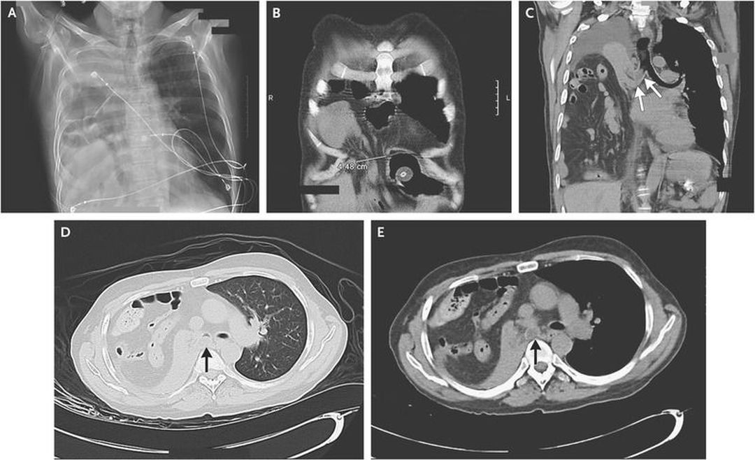 A 54-year-old man with a history of cerebral palsy and mental impairment presented with acute respiratory distress. He was afebrile and had a nonproductive cough. Physical examination revealed the use of accessory muscles of ventilation, decreased right hemithorax expansion, and an absence of breath sounds in the right hemithorax, with audible bowel sounds. The patient had mild hypoxia. A chest radiograph showed near-complete opacification of the right hemithorax, with gas-filled bowel loops on the right that extended to the level of the aortic arch (Panel A). A radiograph obtained approximately 3 months before presentation had shown a small right diaphragmatic hernia. Computed tomography of the chest performed during the current presentation confirmed the presence of a right anteromedial diaphragmatic hernia (Panel B), with a defect in the diaphragm that measured 4.5 cm in diameter. Visible within the right hemithorax was a large volume of abdominal bowel contents (Panels C, D, and E), including the majority of the right colon, the appendix, multiple loops of small bowel, mesenteric fat, and omentum. The right lung was completely collapsed, with mucous plugging of the right mainstem bronchus (arrows). There was only a mild mediastinal shift to the left, a finding that was consistent with the high degree of lung collapse accompanying the hernia and that was probably related to proximal bronchial obstruction. Because of the location of the diaphragmatic defect, the hernia was most likely a Morgagni hernia. These hernias are usually congenital in origin and can increase in size over time, as in this case. In accordance with the wishes of the patient and his family, no surgical repair was attempted.