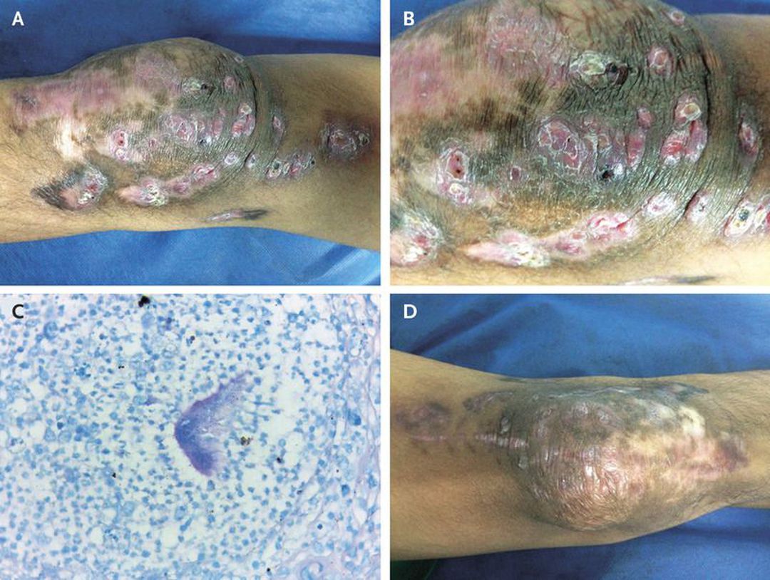A 33-year-old man was referred to our institution in 2015 with lesions on his left knee that had worsened over the course of several years. In 2010, at which time he had an unremarkable medical history, he was involved in a motor vehicle collision that resulted in several superficial soft-tissue bruises on his left knee and no associated fractures. Two years after the collision, the patient sought medical attention for skin thickening and several subcutaneous nodules smaller than 1 cm that had gradually developed on the medial and lateral sides of his knee and had subsequently disseminated to the thigh. The patient reported no fevers or other systemic symptoms. He received several courses of empirical antibiotics and had minimal clinical improvement. On physical examination during the current presentation, the left knee was noted to have edema, erythema, hyperpigmentation, hyperkeratinization, and several indurated nodules with scabs and sinus tracts, but without purulence or granule secretion (Panels A and B). The patient had a normal range of motion and muscular strength, although there were some areas of hypoesthesia on the knee. He underwent surgery with débridement, and intraoperative cultures grew actinomyces species, a finding that was corroborated by histologic examination, on which an eosinophilic halo — known as the Splendore–Hoeppli phenomenon — was observed surrounding the organism (Panel C). He was treated with amoxicillin–clavulanic acid, administered orally for 1 year, and had clinical improvement but not full resolution (Panel D).