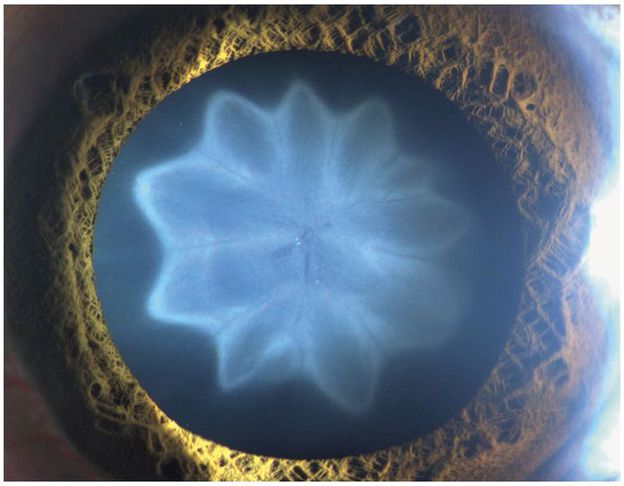 A 30-year-old man presented with progressively deteriorating vision in the left eye. Three months earlier, he had sustained a concussion along with blunt trauma to the left eye in a collision with a motor vehicle that occurred while he was riding a bicycle without wearing a helmet. On ocular examination at this presentation, his best corrected visual acuity was found to be 20/20 in the right eye and 20/40 in the left eye. The intraocular pressure was 12 mm Hg in both eyes. Slit-lamp examination with pupillary dilation revealed white opacities in the form of decagonal “petals” in the left eye. Each petal had a dense margin and was separated by a linear suture line. The fundus and retinal periphery were normal in both eyes. The patient was advised to undergo cataract surgery with intraocular lens implantation; he has not undergone the procedure. The petaloid cataract is classically seen in patients who have had blunt trauma to the eye.