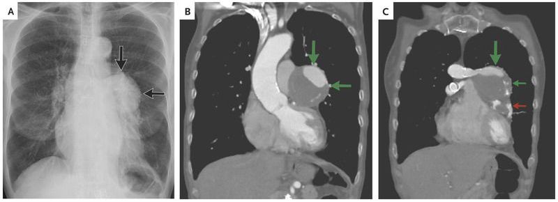 A 78-year-old woman who had undergone coronary-artery bypass graft surgery 30 years earlier and had a smoking history of 54 pack-years presented to the emergency department with shortness of breath and fatigue. The troponin level was within the normal range. There was no evidence of ischemic changes on electrocardiography. Radiography of the chest revealed a mediastinal, hilar mass lesion on the left side (Panel A, arrows). Computed tomographic angiography of the chest revealed two partially thrombosed aneurysms of the saphenous-vein grafts. The larger aneurysm arose from the superior graft that was anastomosed to the left anterior descending coronary artery (Panel B, arrows; Panel C, green arrows), and the smaller aneurysm arose from the inferior graft, which was anastomosed to the diagonal artery (Panel C, red arrow). In view of the risks of undergoing surgery again and the absence of angina, the patient continued to pursue a conservative course and the symptoms at presentation resolved. The patient was lost to follow-up.