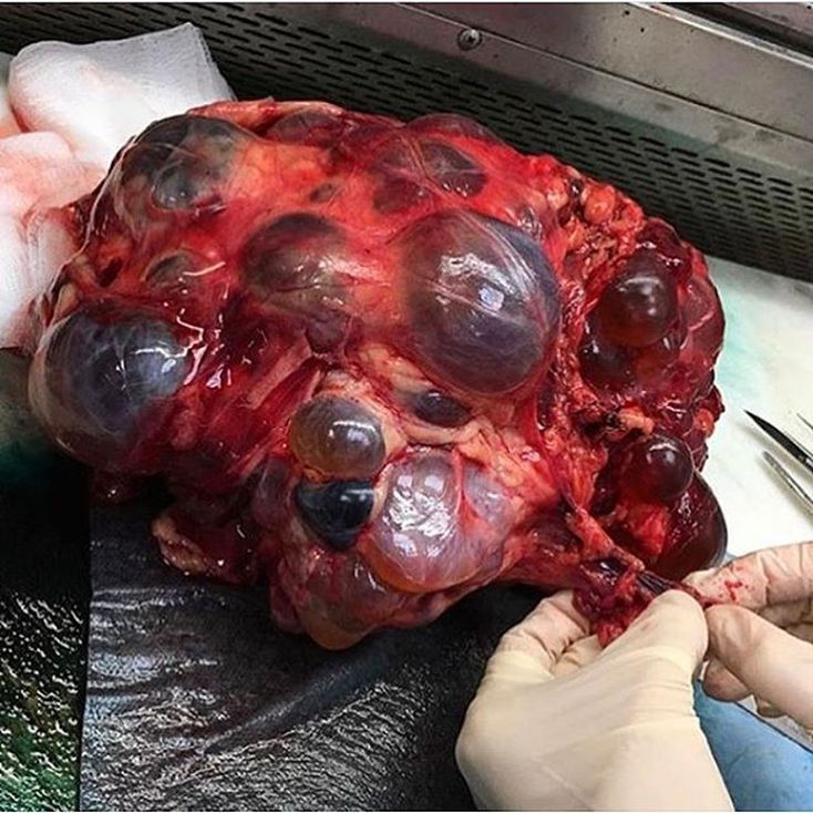 Notice the numerous cysts grown in the kidney. Polycystic kidney disease is hereditary and bilateral. The autosomal recessive form has numerous small cysts that arise only from the collecting ducts and result in bilateral symmetrical enlargement of the kidneys. In the autosomal dominant type, cysts arise from all areas of the nephron, which are usually larger and more variable in size (see above) than in the recessive type. These cysts are filled with fluid. If too many cysts grow or if they get too big, the kidney can become permanently damaged beyond repair, eventually leading to chronic renal failure. The polycystin-1 and polycystin-2 proteins appear to be involved in both types of the disease due to defects in both proteins as a result of mutated genes, the PKD1 and PKD2. The disease is characterized by a ‘second hit’ phenomenon, in which a mutated dominant allele is inherited from a parent, with cyst formation occurring only after the normal, wild-type gene sustains a second genetic ‘hit’, resulting in renal tubular cyst formation and disease progression. The diagnosis is confirmed by ultrasound or CT, usually after the patient initially presents with hypertension, uremia, hematuria (blood in urine) with or without flank pain. The disease is a major cause of end-stage renal disease so patients should be on dialysis before receiving a kidney transplant.