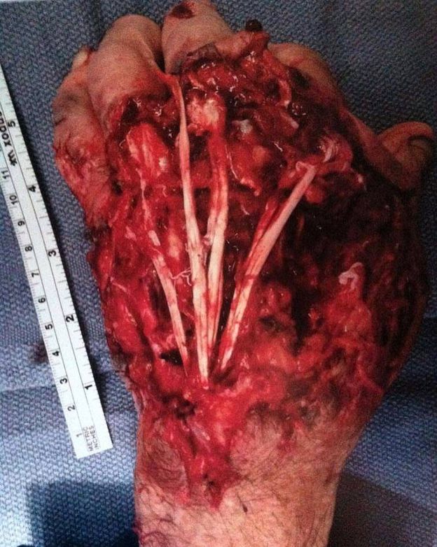 The patient was clearing thigh-length grass when he reached down to unclog the machine not realizing he had put his hand inside the gap between the lawnmowers box and blade. There was severe torsion and avulsion as shown, exposing all the tendons and delicate tissues underneath. He ended up losing his ring and middle fingers and doctors have managed to graft skin from the lost fingers to the top of his hand.