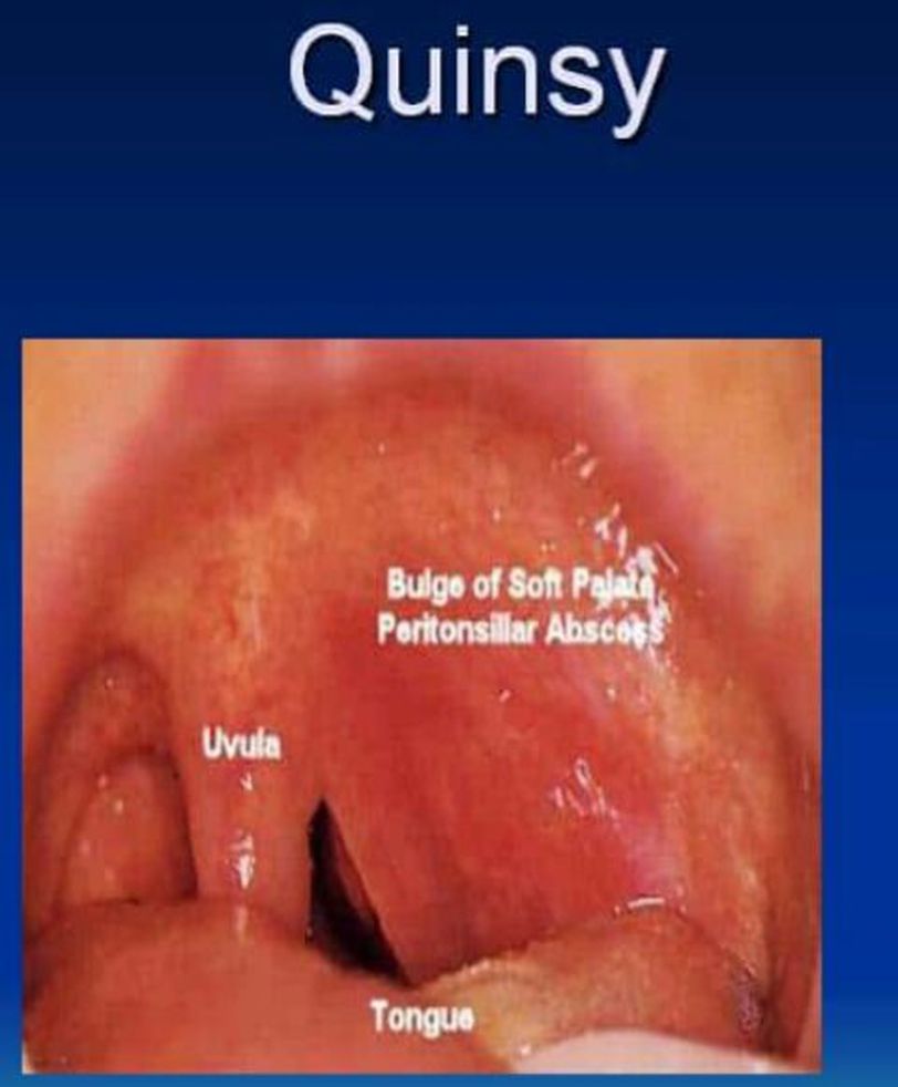 Quinsy, also known as a peritonsillar abscess, is a rare and potentially serious complication of tonsillitis. The abscess (a collection of pus) forms between one of your tonsils and the wall of your throat. This can happen when a bacterial infection spreads from an infected tonsil to the surrounding area. Quinsy can occur at any age, but most commonly affects teenagers and young adults. It's possible to get it more than once. Signs and symptoms Symptoms of quinsy can include: a severe and quickly worsening sore throat, usually on one side swelling inside the mouth and throat difficulty opening your mouth pain when swallowing difficulty swallowing, which may cause you to drool changes to your voice or difficulty speaking bad breath earache on the affected side headache and feeling generally unwell difficulty breathing Some people with quinsy may also have a high temperature (fever), although this sometimes passes before the abscess develops