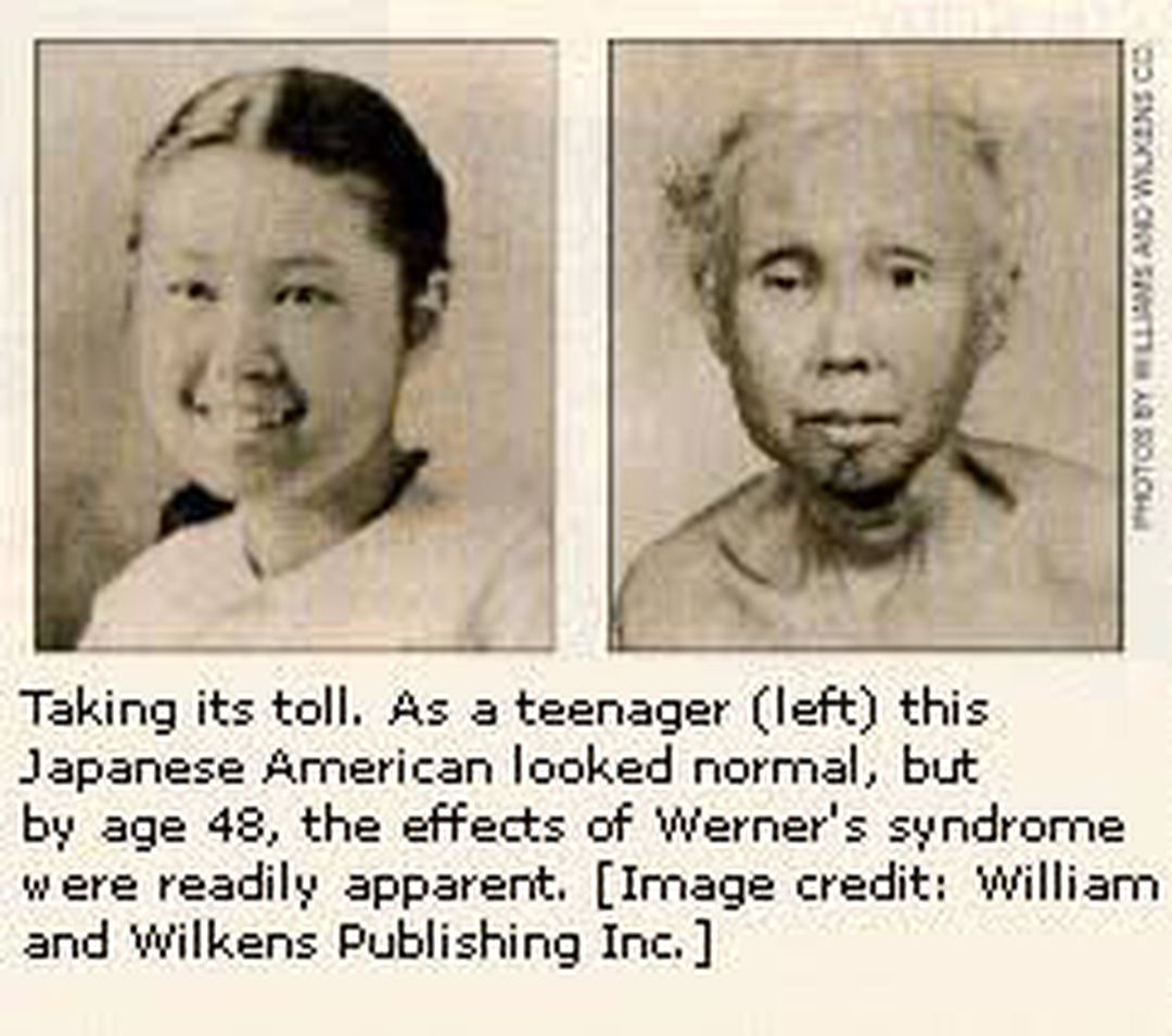 Werner syndrome (WS), also known as "adult progeria", is a rare, autosomal recessive disorder which is characterized by the appearance of premature aging.Werner syndrome is named after the German scientist Otto Werner. He identified the syndrome in four siblings observed with premature aging, which he explored as the subject of his dissertation of 1904.It has a global incidence rate of less than 1 in 100,000 live births (although incidence in Japan and Sardinia is higher, affecting 1 in 20,000–40,000 and 1 in 50,000, respectively). 1,300 cases had been reported as of 2006. Affected individuals typically grow and develop normally until puberty; the mean age of diagnosis is twenty-four, often realized when the adolescent growth spurt is not observed. The youngest person diagnosed was six years old. The median and mean ages of death are 47–48 and 54 years, respectively. The main cause of death is cardiovascular disease or cancer.