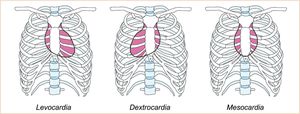 Levocardia:::: Reversal of all the abdominal and thoracic organs (situs inversus) except the heart, which is still in its usual location on the left. Dextrocardia :::: A rare condition in which the apex of the heart is located on the right side of the body. Mesocardia:::: atypical location of the heart, with the apex in the midline of the thorax.