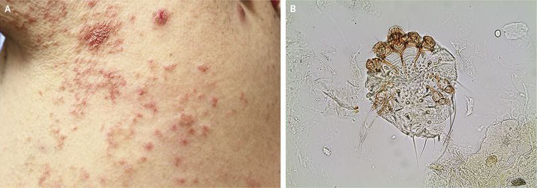 A 61-year-old woman presented with severe pruritic rash, which had been present for 6 months. Excoriated papules with honey-colored crusting were present on the abdomen, back (Panel A), arms, and legs. Treatment with fluocinonide cream and doxycycline for suppurative folliculitis and prurigo nodularis for a period of 4 weeks produced no resolution of the rash. A biopsy of the rash revealed mixed inflammatory infiltrate with eosinophils, which was suggestive of a drug-related rash. Discontinuation of all medications resulted in no change. Finally, skin scrapings from several web spaces on the hands (scabies preparation) showed a mite under light microscopy (Panel B). Topical permethrin cream that was applied overnight to the entire body and repeated in 1 week cleared the rash within 2 weeks after the first application. Scabies is a mite-borne disease characterized by pruritus that is classically worse at night. Untreated disease can be associated with extensive eczematization of the skin owing to constant scratching. Secondary infections such as impetigo, ecthyma, paronychia, or furunculosis can also occur. Clinically, burrows are difficult to visualize and may be disguised by excoriations and impetigo. Biopsy specimens often show nonspecific changes without burrows or mites, since patients may have only 6 to 10 mites on their entire cutaneous surface.