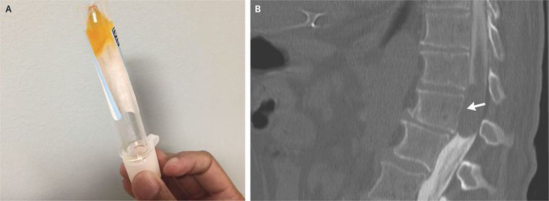 A 64-year-old man presented with a 1-week history of progressive bilateral weakness in the legs. The neurologic examination showed paralysis of the legs and decreased sensation starting at the L1–L2 level. Magnetic resonance imaging could not be performed owing to the presence of a pacemaker. Since the patient had atrial fibrillation and an elevated prothrombin time, there was concern about a possible spinal hematoma. Computed tomography (CT) of the spine showed only degenerative disk disease. On lumbar puncture, the cerebrospinal fluid (CSF) was xanthochromic, viscous, and coagulated in the tube (Panel A). The protein level in the CSF was more than 1500 mg per deciliter, and the glucose level was 45 mg per deciliter (2.5 mmol per liter). The CSF contained less than one nucleated cell per cubic millimeter, and the results of Gram’s staining and cultures were negative. The combination of elevated protein, xanthochromia, and hypercoagulation of CSF is pathognomonic for Froin’s syndrome, which can occur with blockage of CSF flow by a spinal cord mass or with meningeal irritation from meningitis. CT myelography showed a large intradural, extramedullary lesion at T11–T12 (Panel B, arrow), which was compressing the spinal cord. The patient underwent total laminectomy of T11 and T12 and partial laminectomy of L1 with tumor resection; a benign nerve-sheath tumor (schwannoma) was diagnosed on pathological analysis. No radiotherapy or chemotherapy was performed. After 1 month of rehabilitation, the patient had improved sensation but continued having leg paralysis.