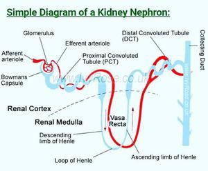 đŻđŻThe Simple Structure of a Kidney Nephron:đŻđŻ Kidney nephrons are the functional units of the kidneys. There are normally approx. one million (0.8 - 1.5 million) kidney nephrons in each of the two kidneys in the body. Blood filtration processes within the kidney. There are two parts of a kidney nephron: the Renal Corpuscle, and The Renal Tubule. (1) Renal Corpuscle The renal corpuscle is the part of the kidney nephron in which blood plasma is filtered. The term "corpuscle" means "tiny" or "small" body. The renal corpuscle of each kidney nephron has two parts - they are the Glomerulus, which is a network of small blood vessels called capillaries, and the Bowman's Capsule (also known as the Glomerular Capsule), which is the double-walled epithelial cup within which the glomerulus is contained. Within the glomerulus are glomerular capillaries that are located between the afferent arteriole bringing blood into the glomerulus and the efferent arteriole draining blood away from the glomerulus. The (outgoing) efferent arteriole has a smaller diameter than the (incoming) afferent arteriole. This difference in arteriole diameters helps to raise the blood pressure in the glomerulus. The area between the double-walls of the Bowman's Capsule is called the capsular space. The cells that form the outer edges of the glomerulus form close attachments to the cells of the inner surface of the Bowman's Capsule. This combination of cells adhered to each other forms a filtration membrane that enables water and solutes (substances that are dissolved in the water/blood) to pass through the first wall of the Bowman's Capsule into the capsular space. This filtration process is helped by the raised blood pressure in the glomerulus - due to the difference in diameter of the afferent and efferent arterioles. So To Summarise: In the renal corpuscle blood is forced through the glomerular capillaries at higher pressure than the pressure at which the blood generally travels around the body (and also into the kidney itself). Helped by the increased pressure in the glomerular capillaries, a filtration process occurs in which some blood fluid is forced out of the glomerulus and int