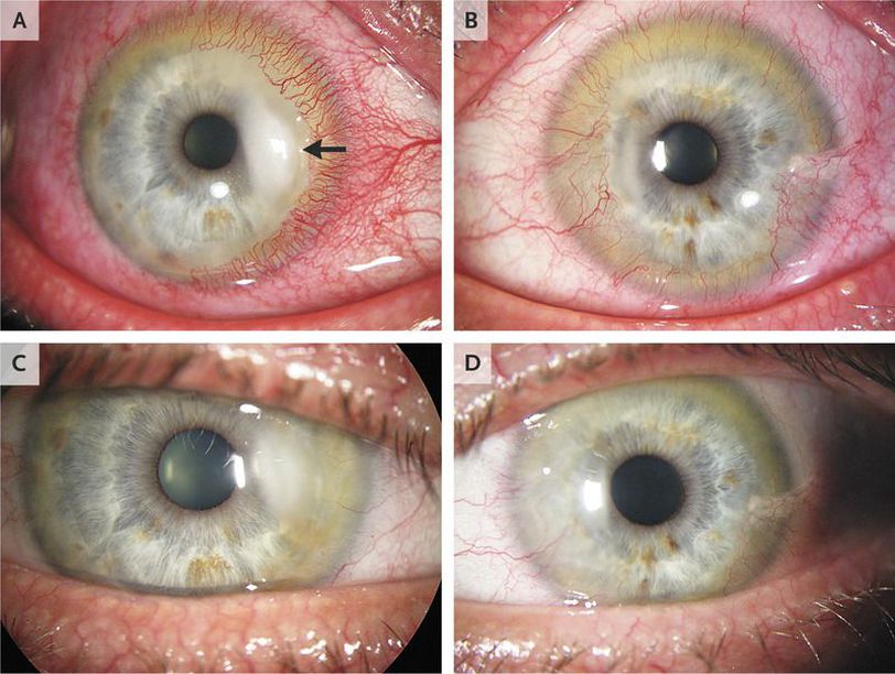 A 58-year-old man presented with recurrent flushing of the face and redness, foreign-body sensation, and blurred vision in both eyes. These symptoms had persisted for 6 years, with intermittent remissions lasting up to 12 weeks. The best corrected visual acuity was 20/20 in the right eye and 20/25 in the left eye. Slit-lamp examination revealed telangiectasia with hyperemia of the eyelid margins, conjunctival hyperemia, and superficial circular neovascularization of the cornea in both eyes, with corneal infiltrate in the right eye (Panel A, arrow) and pseudopterygium in the left eye (Panel B). Corneal topography revealed high irregular corneal surfaces that were consistent with astigmatism and pseudokeratoconus Rosacea typically manifests as transient erythema of the face, and many subtypes of rosacea have been categorized, including ocular rosacea. The patient had a response to 10 days of treatment with oral doxycycline and topical dexamethasone, frequent use of artificial tears, and eyelid hygiene. At 4 weeks of follow-up, the ocular hyperemia was reduced and the corneal infiltrate had resolved substantially (Panels C and D show the right eye and left eye, respectively). Ophthalmologic evaluation at 30 months of follow-up revealed a stable ocular state with minimal signs of inflammation.