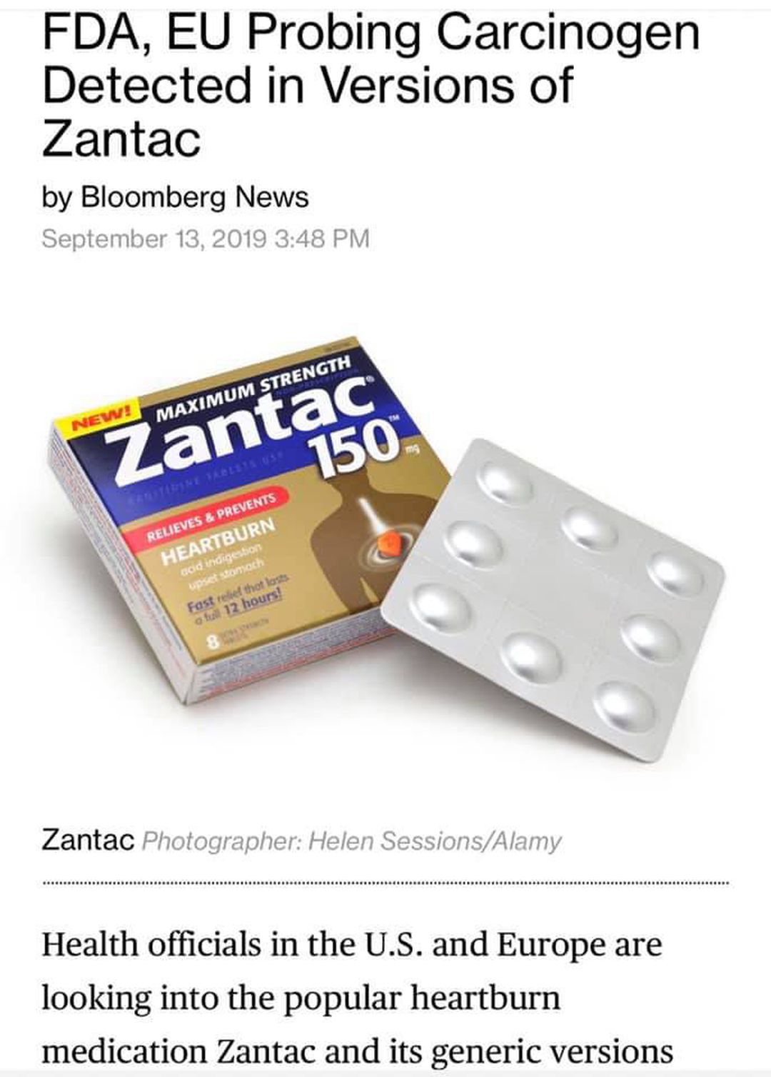 --The U.S. Food and Drug Administration has learned that some ranitidine medicines, including some products commonly known as the brand-name drug Zantac, contain a nitrosamine impurity called N-nitrosodimethylamine (NDMA) at low levels. NDMA is classified as a probable human carcinogen (a substance that could cause cancer) based on results from laboratory tests. NDMA is a known environmental contaminant and found in water and foods, including meats, dairy products, and vegetables. The FDA has been investigating NDMA and other nitrosamine impurities in blood pressure and heart failure medicines called Angiotensin II Receptor Blockers (ARBs) since last year. In the case of ARBs, the FDA has recommended numerous recalls as it discovered unacceptable levels of nitrosamines. When the agency identifies a problem, it takes appropriate action quickly to protect patients. The FDA is evaluating whether the low levels of NDMA in ranitidine pose a risk to patients. FDA will post that information when it is available. Patients should be able to trust that their medicines are as safe as they can be and that the benefits of taking them outweigh any risk to their health. Although NDMA may cause harm in large amounts, the levels the FDA is finding in ranitidine from preliminary tests barely exceed amounts you might expect to find in common foods. Ranitidine is an over-the-counter (OTC) and prescription drug. Ranitidine is an H2 (histamine-2) blocker, which decreases the amount of acid created by the stomach. Over-the-counter ranitidine is approved to prevent and relieve heartburn associated with acid ingestion and sour stomach. Prescription ranitidine is approved for multiple indications, including treatment and prevention of ulcers of the stomach and intestines and treatment of gastroesophageal reflux disease. The agency is working with international regulators and industry partners to determine the source of this impurity in ranitidine. The agency is examining levels of NDMA in ranitidine and evaluating any possible risk to patients. The FDA will take appropriate measures based on the results of the ongoing investigation. The agency will provide more information as it becomes available. The FDA is not calling for individuals to stop taking ranitidine at this time; however, patients taking prescription ranitidine who wish to discontinue use should talk to their health care professional about other treatment options. People taking OTC ranitidine could consider using other OTC medicines approved for their condition. There are multiple drugs on the market that are approved for the same or similar uses as ranitidine.