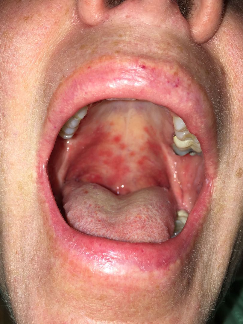 Patient presents with oral discoloration on palette and white tongue. Symptoms include fever, mild cough, low grade fever, congestion, and burning sinuses. Patient is in mid 50’s and was given oral antibiotics to help with sinuses .Thoughts on what this could be?