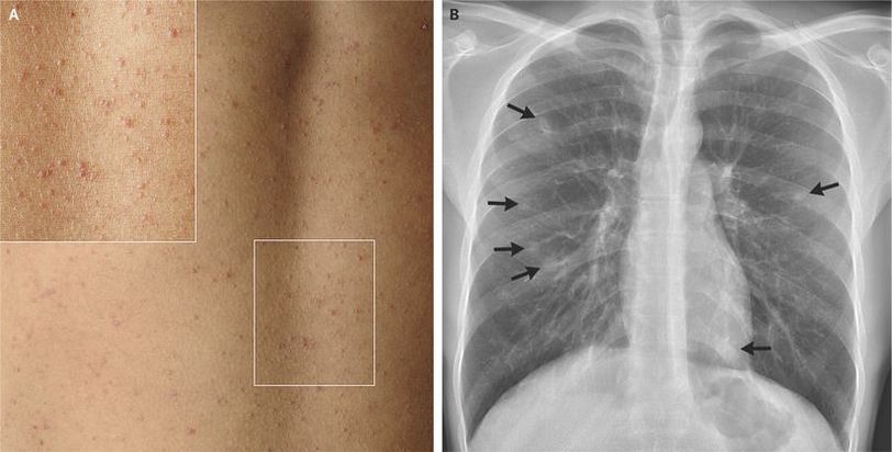 During a 3-month elective in Uganda, a 24-year-old Dutch medical student swam in the Nile River. Two months after his return, he presented to a clinic with a 7-week history of a nonproductive cough and malaise, as well as a 2-week history of diarrhea and nonpruritic rash. Physical examination and diagnostic testing revealed multiple small papules on the trunk (Panel A), eosinophilia (3.0Γ109Β eosinophils per liter), mildly elevated liver-function values, and several ill-defined nodular infiltrates on the chest radiograph (Panel B, arrows). Tests were positive for antibodies against schistosomal worms but not for antibodies against schistosomal eggs. Analysis of a skin-lesion biopsy specimen revealed nonspecific eosinophilic infiltrates without eggs. These findings support the diagnosis of acute schistosomiasis, or Katayama fever. Katayama fever is thought to be due to an immunologic response to the antigens present during the maturation process of the schistosomal worm. It typically manifests 2 to 10 weeks after exposure as fever, cough, urticarial rash, and fatigue, accompanied by eosinophilia and transient pulmonary infiltrates. Treatment with a single oral dose of praziquantel, preferably given after the acute stage, typically results in complete cure, as was seen in this patient.