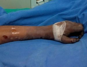 Answer is this is a complications of arterial blood gas measurement the radial artery got occluded leading to gangrene formation